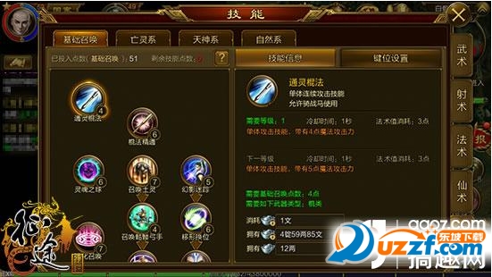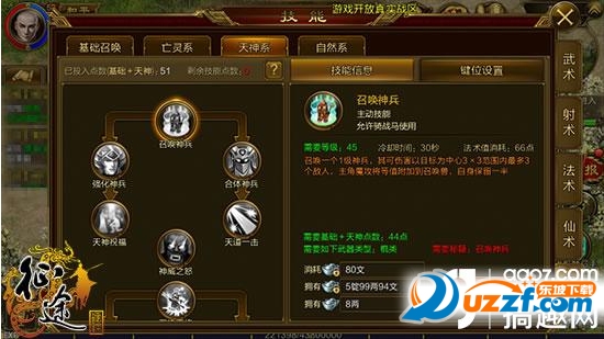 当玩家选择的转职方向是亡灵系时,系统会发放一本“召唤骷髅战士”的秘籍。当玩家的技能点数达到48点的时候,就可以开始学习“召唤骷髅战士”这个技能了。该技能的主要作用是可以召唤一个2级骷髅战士,同时对面前3个横向的敌人造成大量伤害。由“召唤骷髅战士”可以引申出两个不同的技能方向,前期建议选择“强化骷髅战士”+“死者精神”,这两个技能在战斗中帮助你大幅度的提升战力,并且降低自身所受到的伤害值,是战场上无往不胜的法宝。而相对的来说“吞噬骷髅战士”+“白骨之爪”则更倾向于辅助系的,“吞噬骷髅战士”能够将各个召唤兽的战力按照一定的比例加成到人物身上,保持300秒。但该技能冷却时间却长达1200秒。另一面,“白骨之爪”则能够让敌人进入中毒的状态,并保持5秒钟的时间。在技能点有限的情况下,这样的选择是极不明智的。