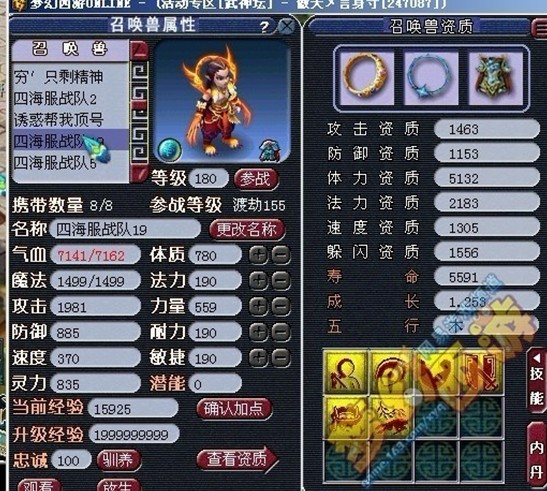 昆嵛山服战女儿村全面出展自身,无战神速度1455、气血8942、防御1649,更有多只全红极品宠物相伴。