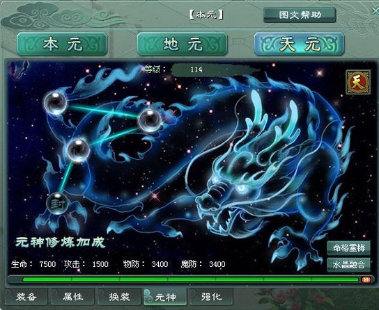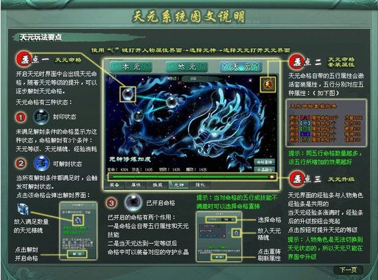 天元开启后,随着天元等级的提升将逐步解封天元命格,天元命格会自带五行属性和天元技能,同五行属性命格越多,天元套装属性越强。每开启一个天元命格,系统将赠送礼包一个,内含7星装备、4等水魂魄及材料兑换券。