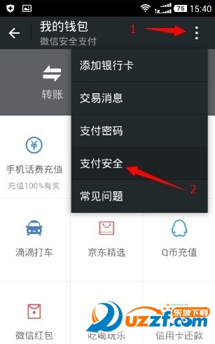 2、打开我的钱包后,点击图中右上角,在弹出的菜单中点击“支付安全”。
