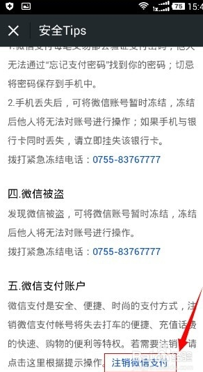 4、在打开的安全Tips界面,把界面滑到最底部,找到“注销微信支付”,点击它。