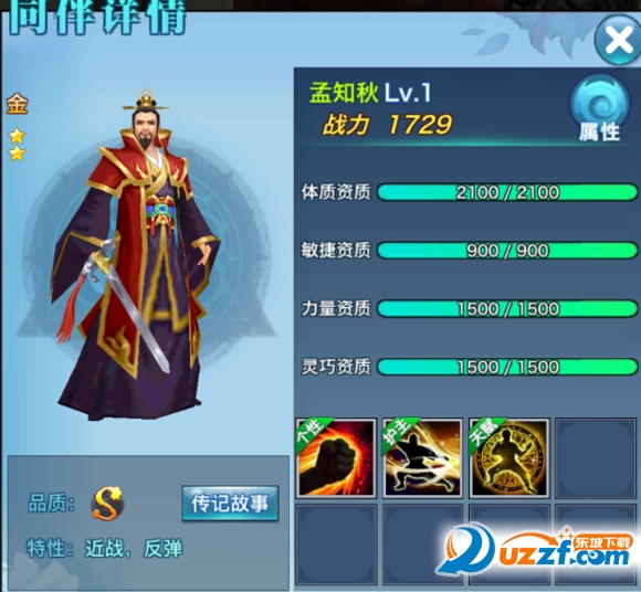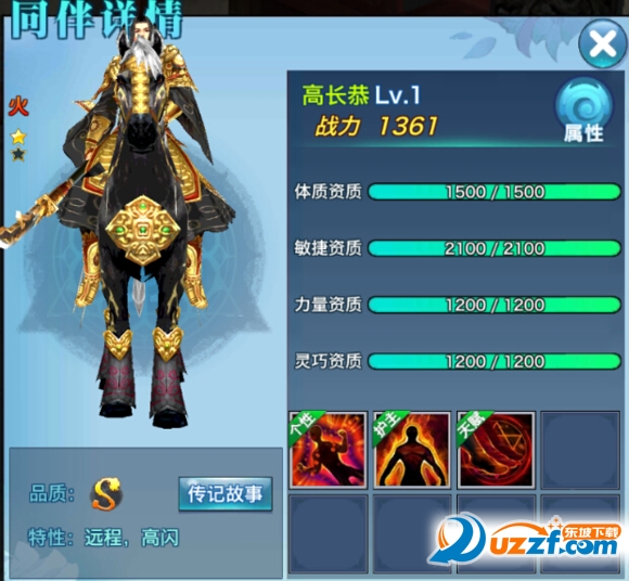 个性技能:威严,战力低于你的敌人攻击降10%。小编评价,还不错的个性,可惜美中不足得是战力低得才降攻,遇上高手就没用