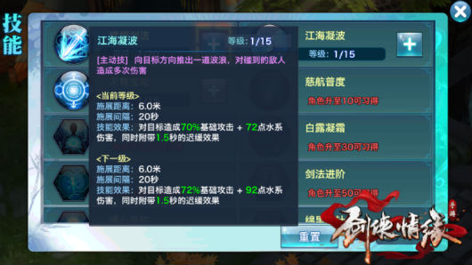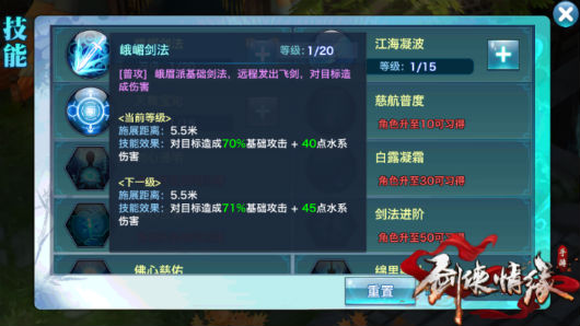 技能运用解析:峨嵋剑法的攻击距离为5.5米在《剑侠情缘》手游中属于中距离的攻击范围,附加水属性的伤害更是表明了峨嵋派的属性为水。由于是普攻技能小编建议优先点满。