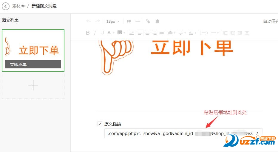 找到素材管理,修改立即下单的原文链接,如下图所示: