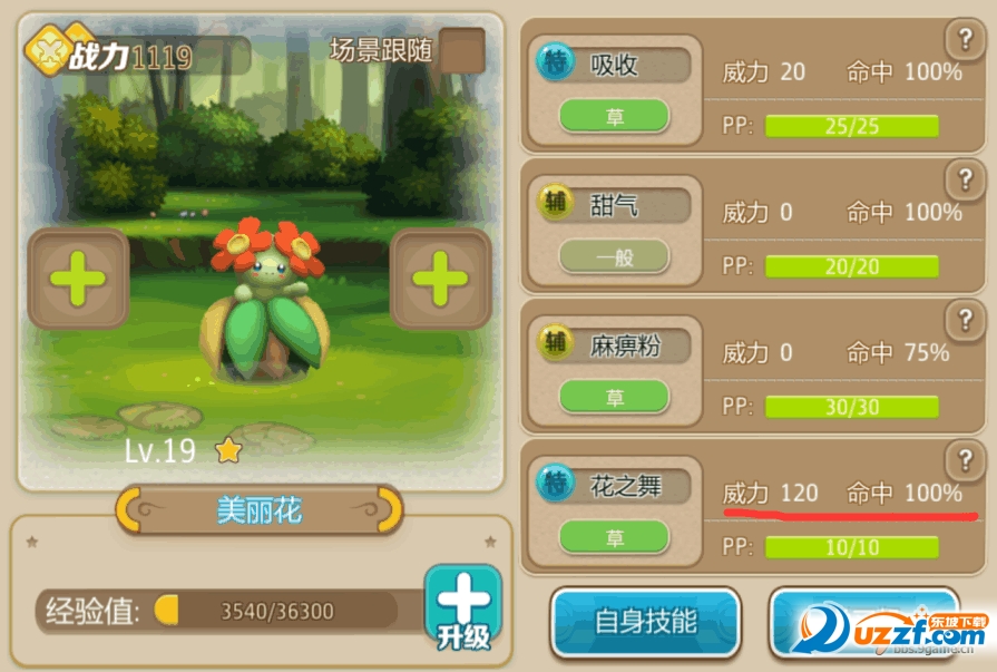 游戏初期除去御三家可以得到3只宠物,第一个是新手任务送的美丽花(原来给的是喇叭芽,改了之后真心不错)自带120威力100%命中的花瓣舞,初期简直能横扫了,甜气减2段命中(听说对抓宠有帮助??) 技能机里学的技能也很丰富,当然缺点也有,自身技能太少,就1个55级阳光烈焰,好歹也来个刀叶什么的吧,吸收实在不给力,花瓣舞pp才10,攻击技能匮乏,50的速度种族让他很难有先手限制敌方的作用,但尽管如此,它初期很少得到的史诗级宠物,可以附带培养,但做不了主力