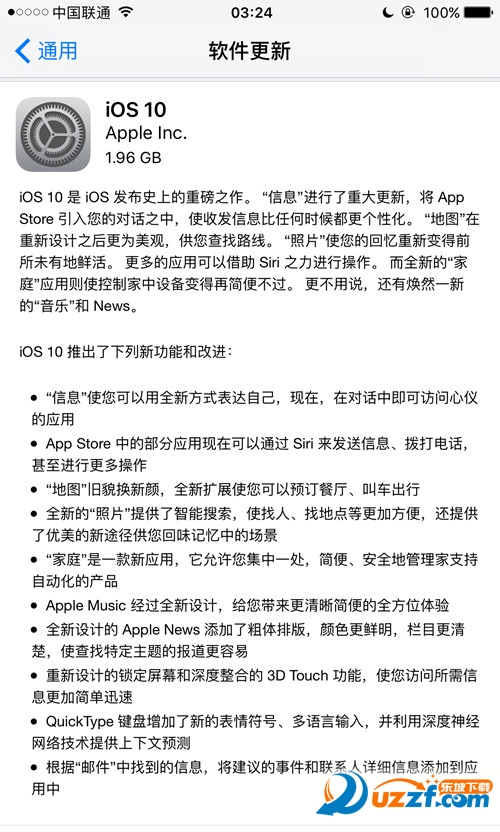 此外,更新后版本号升级至iOS10.0.1,更新包大小约为1.96GB。