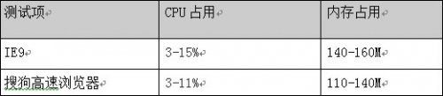 虽然说两款浏览器在资源占用的测试中都表现得很好,但是毕竟在第二项测试搜狗高速浏览器还是领先于IE9,搜狗高速浏览器对网页载入独特的处理方式为用户节约了资源,提高了浏览器和电脑的稳定性。