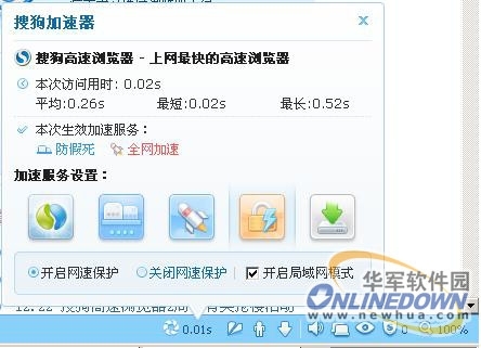 不管你在北方网通、南方电信还是教育网中,点击搜狗高速浏览器状态栏上的“火箭”图标,即可开启“全网加速”功能,实现最快速的访问你所需要访问的网站。