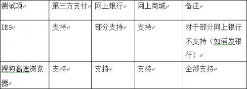 不难看出,IE9相对于IE8在HTML5中的测试得分已经好了很多,但是相对于搜狗高速浏览器的261分还是有一定的距离,在对于HEML5的支持上,搜狗高速浏览器高于IE9。在实际使用中,IE9也出现了对于一些的网上银行不支持的情况,在用到这些网上银行的情况需要切换浏览器进行网上交易。搜狗高速浏览器完全能满足用户网上支付和网上购物的需求。