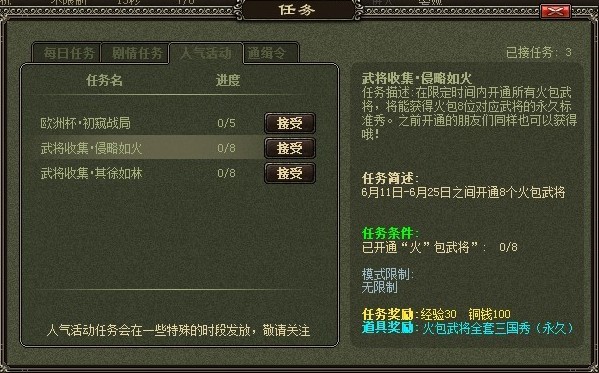 任务内容:在限定时间内开通所有火包武将,将能获得火包8位对应武将的永久标准秀