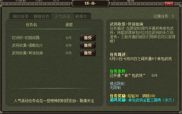 任务内容:在限定时间内开通所有林包武将,将能获得林包8位对应武将的永久标准秀