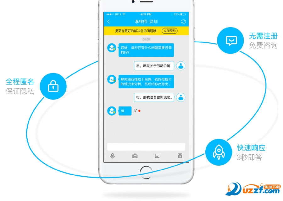 法律咨询:只需要2步点击,30秒内律师迅速呼应交流问题,适宜就立马见面