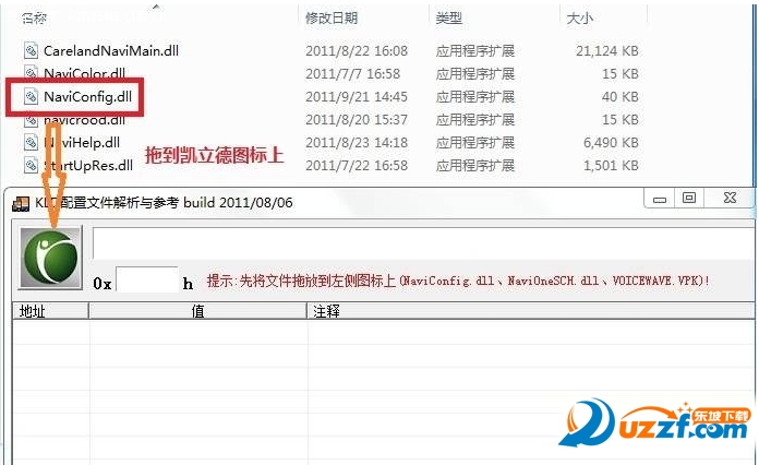 (2)这个程序默认端口和速率是1,4800,所以必须改成自己导航的端口和速率,以我的导航为例,将下载的凯立德文件打开,同样打开NaviResFile这个文件夹!在里面找到NaviConfig.dll这个也就是凯立德端口文件!拖到左上角的凯立德标志内,出现了主程序的配置说明,0x3EC8对应端口值,x3ECE对应速率,这时在需要修改的值上双击,即可对其进行编辑,我的导航是将0x3EC8端口值改为1, x3ECE速率值改成9600,回车或切换后即修改完毕。