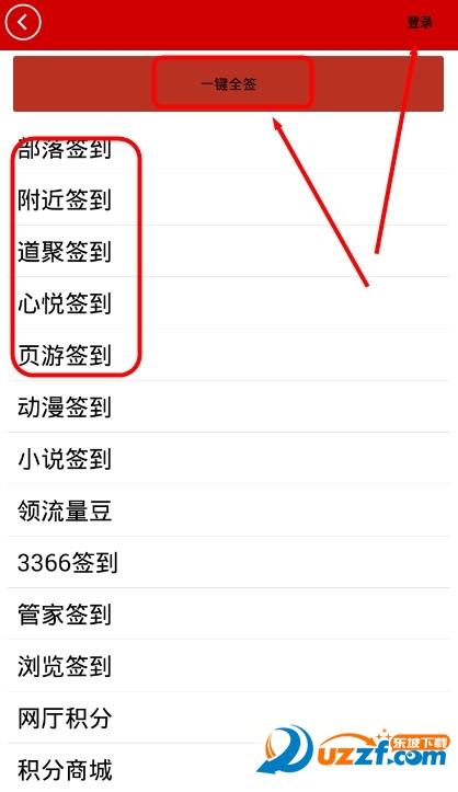 2.登陆账号,点击你需要的签到板块,或者一键全签即可。