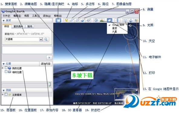 (Gooogle Earth主界面↓如果不了按钮对应的功能请参考下面的解说)