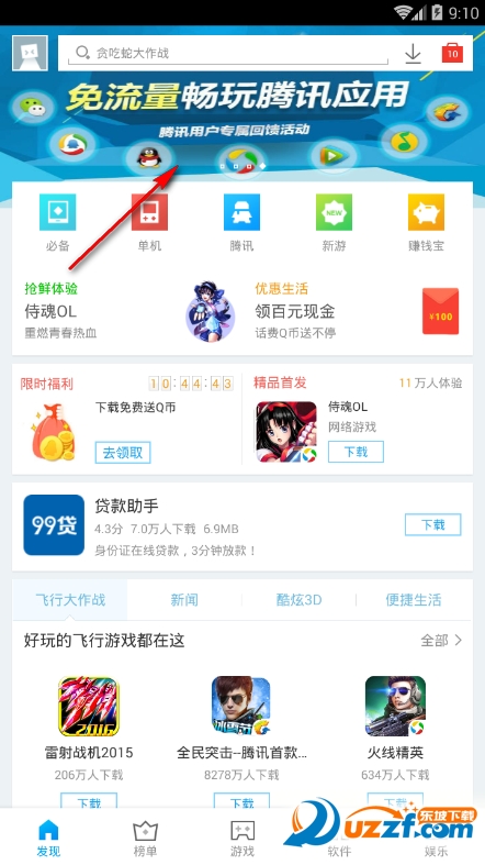 第二步:点击最上面的广告,免流量畅玩腾讯应用;