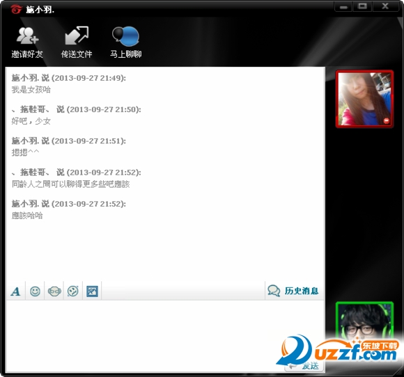 这款软件有和QQ一样的聊天功能(废话,不然怎么联系),上面的三个图标的“邀请好友”是将其邀请至多人交谈,“传送文件”不解释,“马上聊聊”则是将好友邀请进入自己的聊聊频道进行聊天。(PS:聊聊频道是台港澳和新加坡地区专属,你要进去也很简单,换一下区域和语言设置就行)