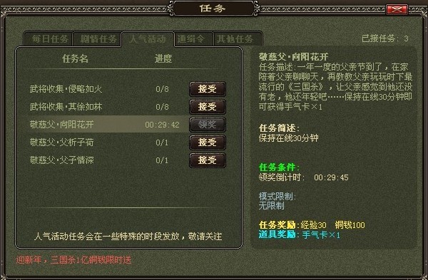 任务内容:活动期间【登陆三国杀online】保持在线30分钟/60分钟/90分钟/120分钟