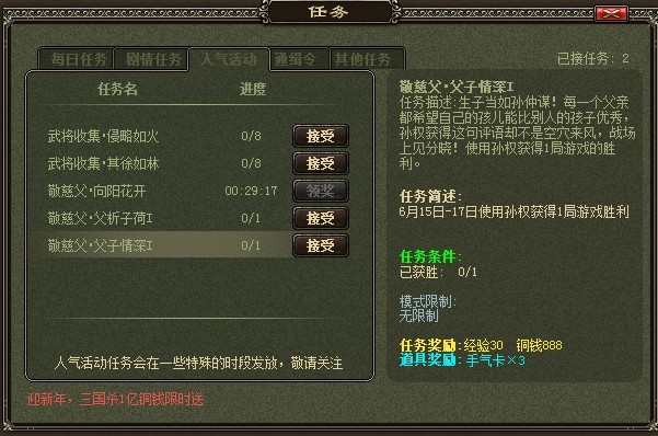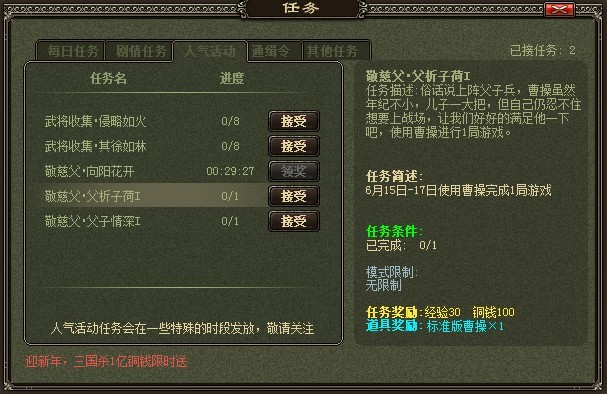 任务奖励:经验30,铜钱100,标准版曹丕(30天权)x1
