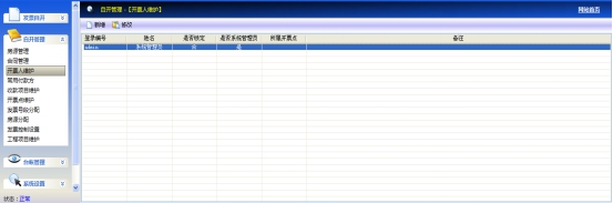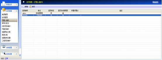 维护开开票人员主要目的是系统管理员没有开具发票的权限需要新增开票人员才有开具发票权限。操作路径:【自开管理】→【开票人员维护】,右边列表显示为已经添加的开票人员,首次使用时默认只有一个系统管理员,如下图: