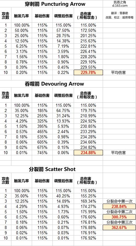 注:箭矢有可能会偏出目标,造成实际效率要低于这表中所表明的数值。因此,在比较它与其他AOE“横扫”技能时,请记住AOE技能是没有发射箭矢而是简单无脑扔出命中敌人的。