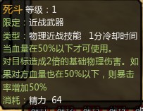 死斗:50血量以下才可以使用。威力与背刺相当,PVP神技。掌握时机可以给对方致命一击。