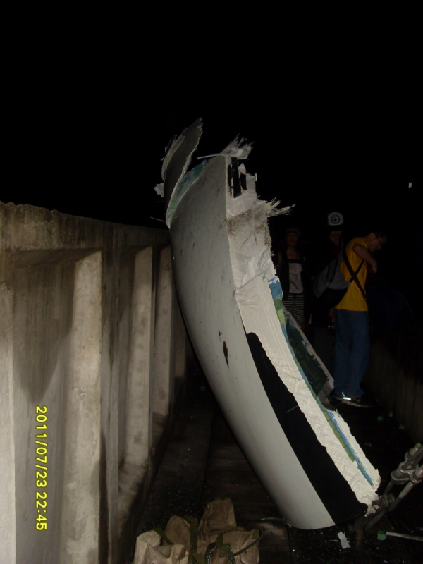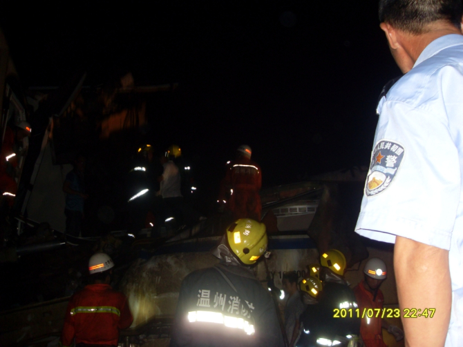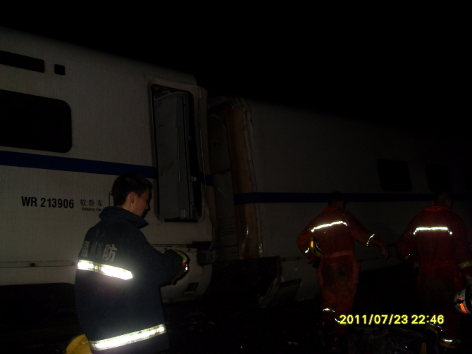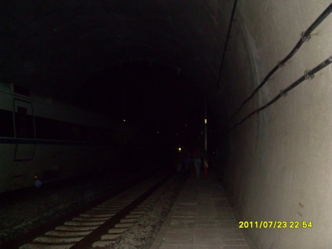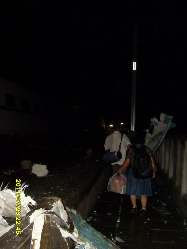 走到事故车厢,因为我们是在掉下桥去的另一边,所以没有看到掉下桥去的车厢的情况,只看到铁轨上停着的车厢,已经完全变形。我看到前面已经不是我乘座的那列车了,而是另一列动车,才相信了之前人群中传说的是因为追尾发生的事故。刚开始有人说是追尾时,好多人都不相信,“动车怎么可能追尾呢?”“前面有车停在铁轨上,怎么后面的车会不知道呢?”可是现在,亲眼看到的事实就这样巨大地呈现在眼前。那辆车的后两节车厢面目全非,几盏救援照明的灯把那里照得雪亮,在一个破口里,有几个消防兵爬进爬出,还不停地高喊着什么。现场气氛十分紧张。警察站在外围阻止人们靠近。我一边惊愕地看着一边匆匆走过。我手里还握着相机,但是警察说不要拍照啦,快点走吧。我也没有心情多拍照片,随人流继续往前走去。走进了一个遂道。原来前面那列车是停在一个遂道里的。