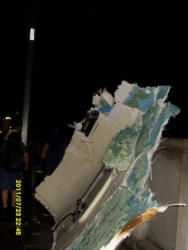 越走就越接近事故严重的车厢,路上开始有越来越多列车的碎片,走着走着,竟然还有大半个残破的车门竖在路边,大家小心地跨过。我跨过去了以后,还是觉得很不可思议。摸索着相机,拿出来拍了一张照片。