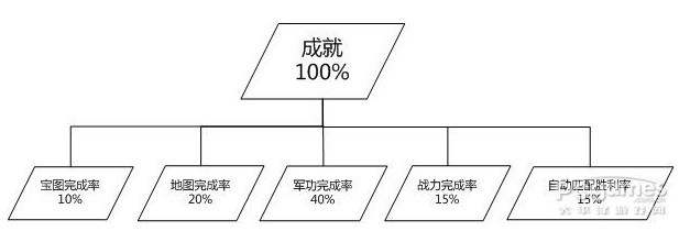 竞技场成就的组成部分:1、竞技场宝图10%;2、竞技场获胜场次20%;3、游戏军功40%;4、自动匹配获胜场次15%;5、战斗力15%。