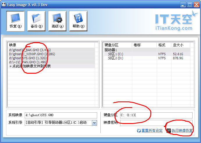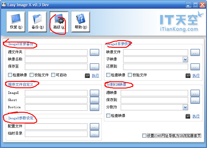 1)本程序借助ImageX.exe、Ghost32.exe和Bootice.exe三个程序来完成所有恢复与备份操作;