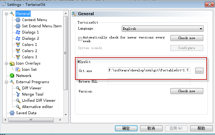 在红框里,我们要设置一下 git 的路径,就是你安装 msysgit的bin文件夹,比如说我的是 F:\software\develop\svn\git\PortableGit-1.7.8-preview20111206\bin,里面会有 git.exe 这个程序。