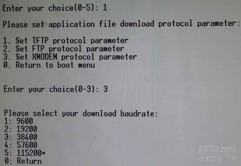 再按BOOT MENU中的1,下载bin文件。同时,这里因为先前我不知道交换机中的配置如何,因此采用XMODERM方式下载bin文件。