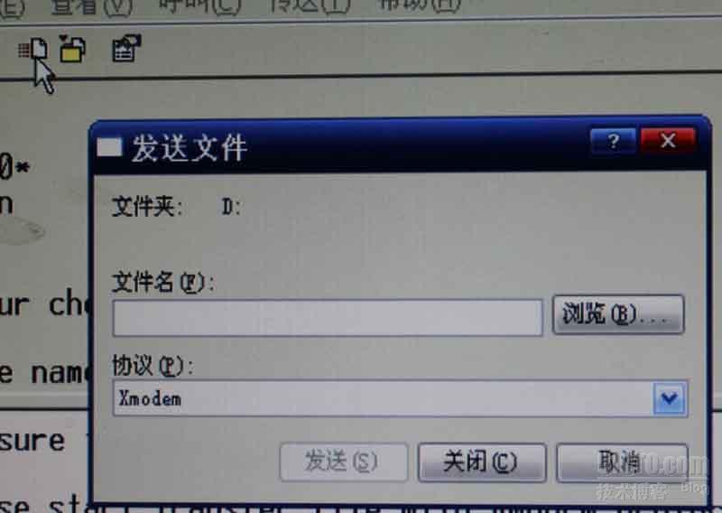 因为我的超级终端位率为9600,所以我选择了1。同时,再选中菜单下的发送按钮,出现发送文件窗口,选择你刚才从正常交换机上下载的bin,并且在这里协议要选择XMODERM哟,根据提示传送文件至交换机。