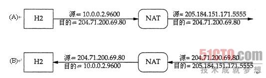 假设主机H2要向204.71.200.69,www.yahoo.com的Web服务器之一,发送一个TCP SYN段,以便打开一个连接。在图2-13A中可以看到这个段离开H2时目的地址为204.71.200.69.80,源地址为10.0.0.2.9600。