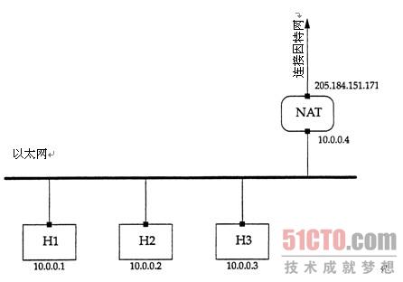 图2-12显示了一个带有三台主机的小型网络,此网络使用的是10/8地址块。还有一台标识为NAT的路由器,它拥有一个私有网络地址和一个因特网地址。