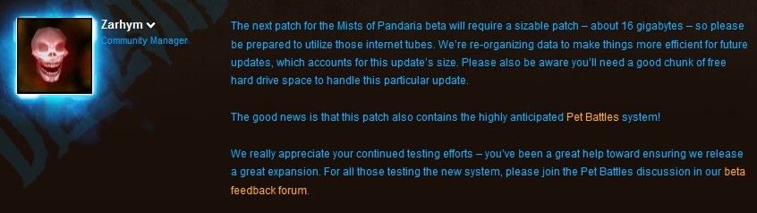 北京时间7月14日,许久未见动静的5.0测试服进行了一次大型更新,在更新后,5.0.3补丁将正式上线。而且随着本次更新,5.0宠物对战系统也将正式亮相。以下是暴雪官方对这个补丁更新的预告: