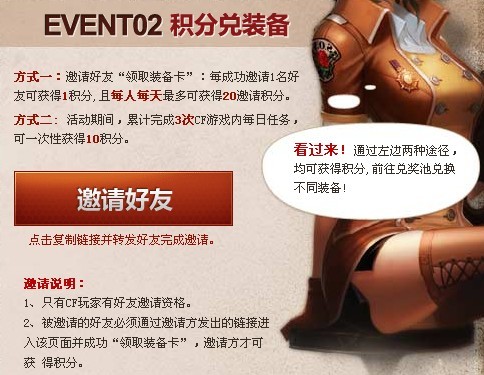 参加《CF武装总动员》领取装备卡,凭卡百分百获得装备;邀请好友参加还能获积分兑CF超值道具!