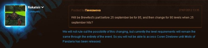 A:我们不排除进行这种改动的可能性,但是目前的计划是在整个节日期间节日Boss的等级要求保持89级不变。因此在《熊猫人之谜》发布之前你没法去找科林·烈酒的麻烦了。
