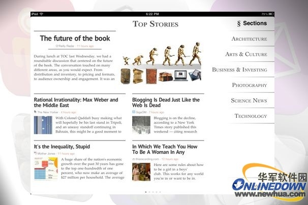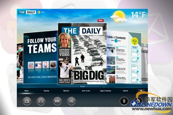 《The Daily》是新闻集团在今年2月独家针对苹果iPad平台推出的新闻应用。它拥有深度和质量的杂志,将报纸的发行变得像网络的更新一样及时。