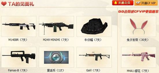 活动1:CF玩家只需要在游戏内完成3600的经验值,次日10点后,即可在活动页面上展开一次别开生面的约会,随机匹配约会对象,约会的对象将会送上TA神秘的见面礼,打开这份神秘礼物,你就有可能获得冲锋枪M14EBR、枪枪M249、超酷牛仔帽、可爱的兔子发带。以下就是见面礼啦!