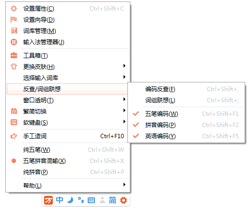 操作方法:首先点击万能五笔弹出功能菜单→反查编码/联想→显示反查编码→使用五笔词库,