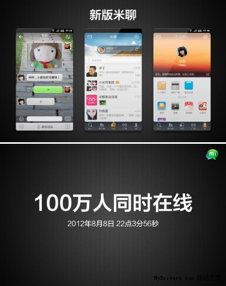 在小米手机2的发布现场,雷军表示新MIUI支持自由桌面,而米聊现在已拥有1700万用户,最高100万同时在线,目前已经支持PC版。