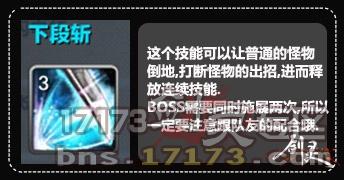 下段斩这个技能可以让普通的怪物倒地,打断怪物的出招,进而释放连续技能。BOSS需要同时施展两次,因此大家一定要注意跟队友配合好。