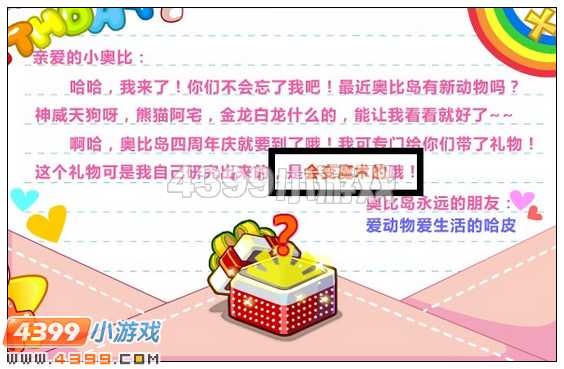 看了贺卡大家应该就会知道这个礼物应该是魔术帽了哦~然后大家把魔法帽这个卡片跟哈皮的卡片配对就可以了哦~