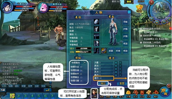 打开人物界面,鼠标点击“+”、“-”按钮可自由分配潜力点,分配完成后,点击“确定”按钮。一旦确定,将无法调整潜力点的分配,只能通过特殊道具来进行洗点。