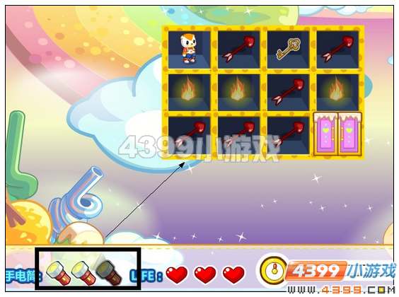 最后大家用按键盘方向键↑↓↔把奥比移动到有思念之箭的格子里去取箭,如果大家忘记了箭的位置,也忘了哪里有火把的话就点击手电筒,去查看下具体位置。