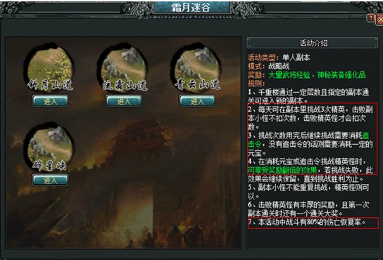 新增的推图副本“超过重楼90层的玩家”从游戏内的主城“兵阵”中可以点击进入。每天都有3次免费挑战精英怪的机会,玩家可以消耗道具“追击令”来增加挑战次数如果没有道具“追击令”可以选择消耗元宝获得增加挑战的次数(有奖励翻倍的效果哦~)。活动中战斗有80%的损失恢复。