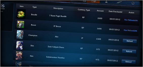 而且目前只支持英雄、皮肤进行退款,符文页、加成道具(金币卡/经验卡)、道具包是不能进行退款的。另外玩家只能对90天内购买的物品进行退款,而且如果你、玩家购买一个英雄和他的皮肤,那么必须先退皮肤,然后才能退英雄。但是目前国服尚未加入这个系统。