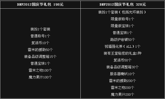 今日,DNF电台对外曝光了DNF2012国庆节礼包称号属性,这次国庆礼包的售价分别为198元和328元。而称号有“红色(蓝色)气息的王室护卫团 ”“红色(蓝色)气息的王室骑士”。