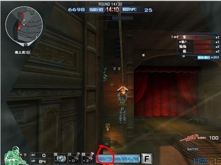 在画了红圈的地方有一个凹进去的地方,把枪丢在那里然后上楼到滑绳这里,让后把枪丢到边缘,切记在你滑下去的时候要拿得到手枪!丢好后,按跳+G下去后再把枪建起来就行了,多试几次就行的了。